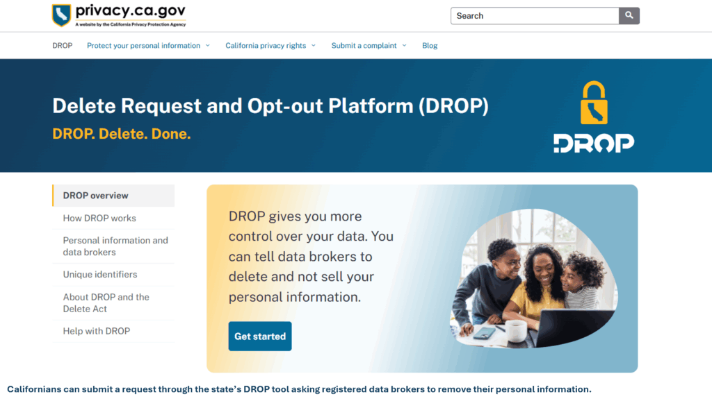 DROP was created under the California Delete Act (SB 362) and is operated by the California Privacy Protection Agency (CPPA). It provides California residents with a centralized way to submit deletion and opt-out requests to data brokers registered in the state.