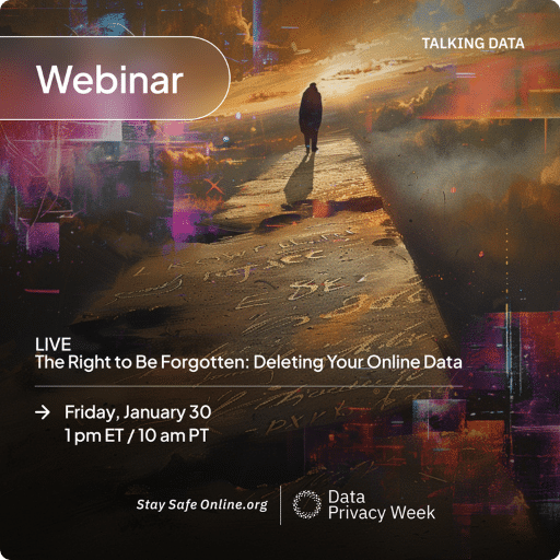 Join us on Friday, January 30, 2026 at 1:00 PM EST for a webinar exploring what the Right to Be Forgotten means for you—and how to request the deletion of your personal data from data broker & people search sites, apps, and search engines.