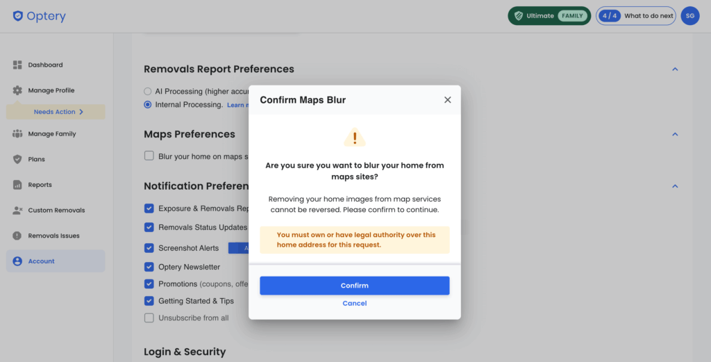We are excited to announce a new privacy control for our Extended and Ultimate plans: Map Blurring. You can now request to blur the street-level imagery of your home on Google Maps and Apple Maps directly through your Optery account.